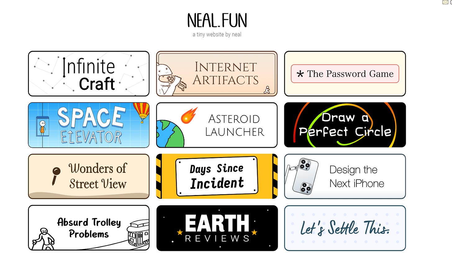 Na, o jei norite žaidimų kuriuose interakcijos geba būti iki skausmo aiškios, bet tuo pat metu visiškai neaiškios, savo naršyklėje pažaiskite Neal Agarwal žaidimus. Buvau jį atradęs ir anksčiau, bet „Infinite Craft“ starto progą apie jį vėl priminė Ieva. Negaliu atsiplėšt jau savaitė.